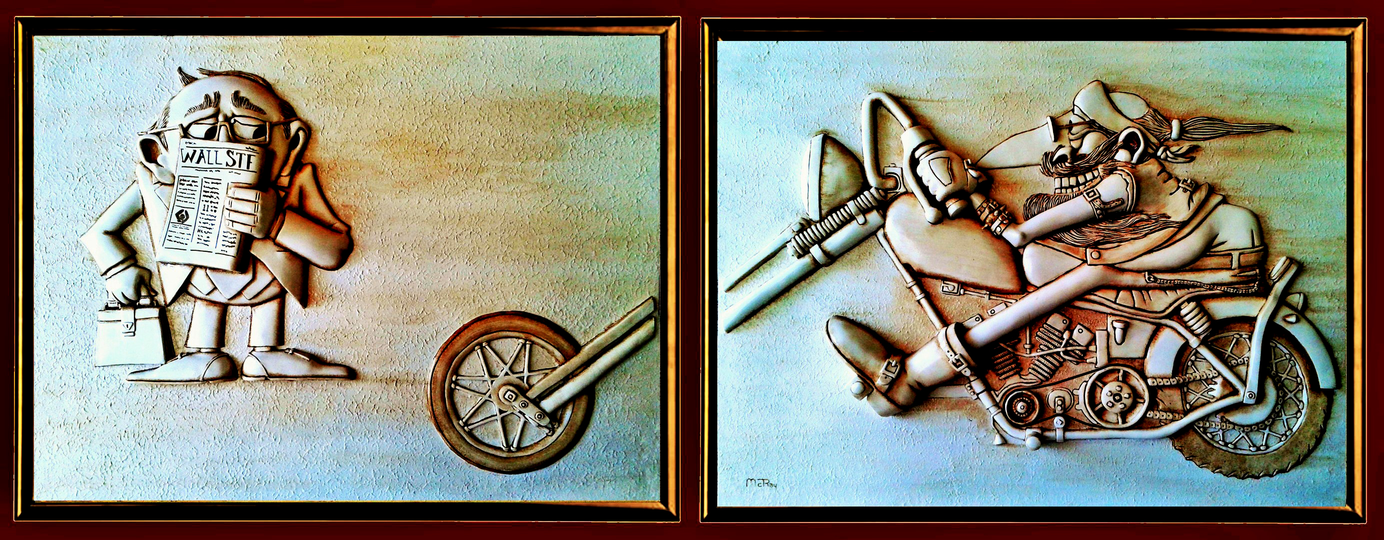 Based on an illustration, about two lifestyles clashing. The message goes deeper than superficial observation. Is the biker antagonizing the businessman, or just enjoying the ride?… Is the businessman nervous, or envious of the approaching free-spirit?… This piece breaks the genre barrier, as it enhances any environment with a whimsical taste of both humor and social commentary.