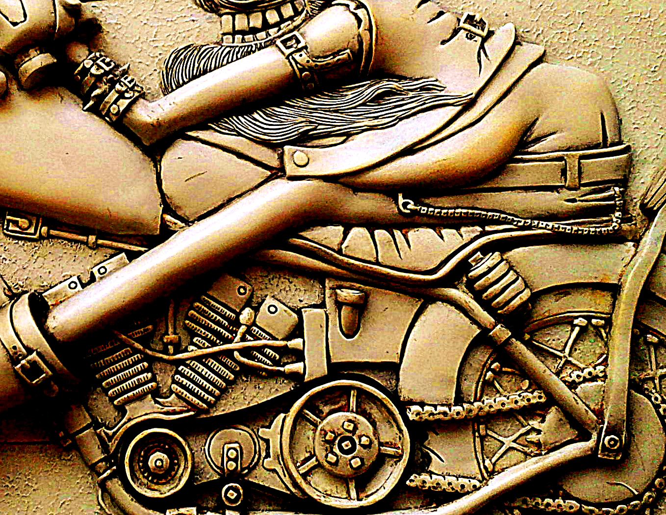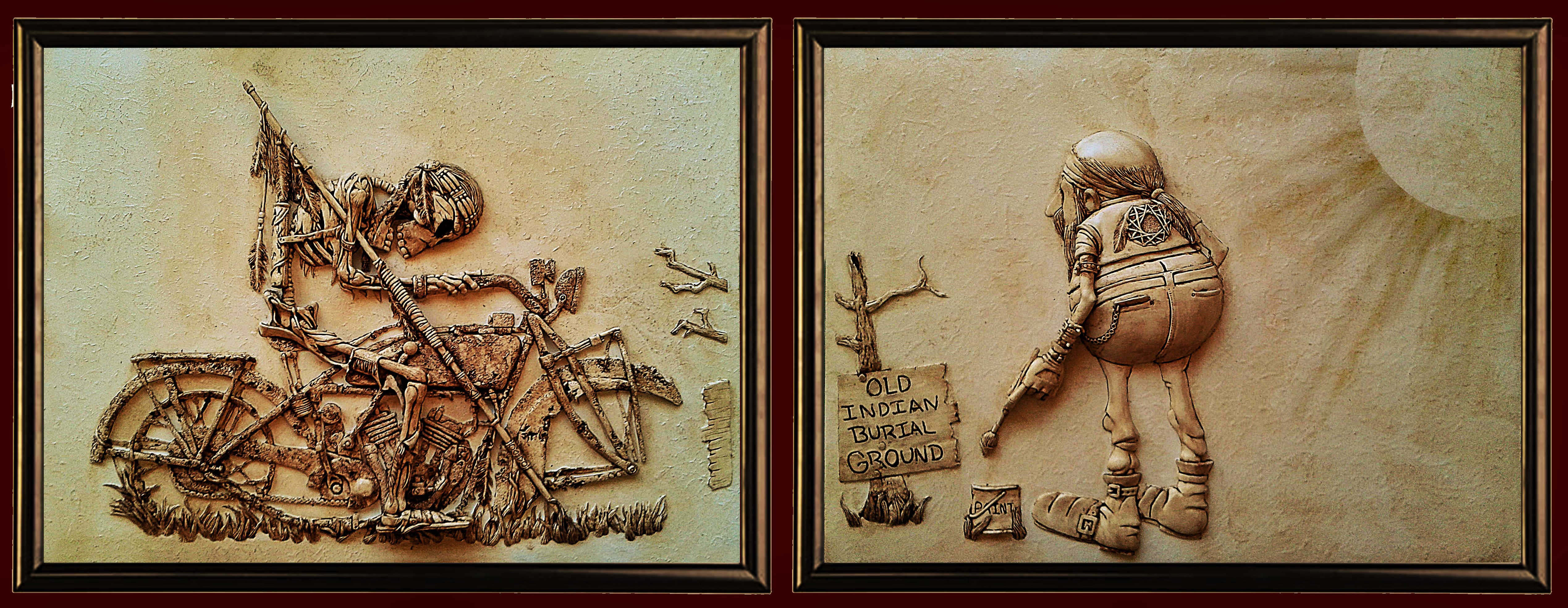 Inspired by the time we lived on the Indian reservation in the Pacific Northwest, I frequently talked with a tribal elder, who would comment how he wanted to be buried on his old 1927 Indian motorcycle… Applying some caricature to the piece, lifts the weight of being taken to literally, allowing it to become both insightful and powerful.